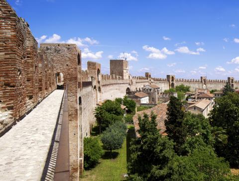 Montagnana, una delle poche città murate dove è ancora possibile ammirare praticamente intatta, la cinta muraria medievale che si snoda per quasi due chilometri, e racchiude l’elegante centro cittadino. Nel mese di settembre Montagnana, Monselice e Cittadella propongono rivisitazioni del Medioevo con cortei in costume d’epoca, sbandieratori, giullari e menestrelli. L'irregolare spessore della cinta è di 1 metro circa, ma rafforzato internamente per tutto il cammino di ronda. E’formata da blocchi di calcare e trachite alla base, intervallati da mattoni e la parte superiore con le merlature in mattoni. Tutto l'esterno doveva essere intonacato, infatti rimangono ampie tracce d'intonaco bianco. Per tutto i lpercorso svettano numerose torri di controllo.